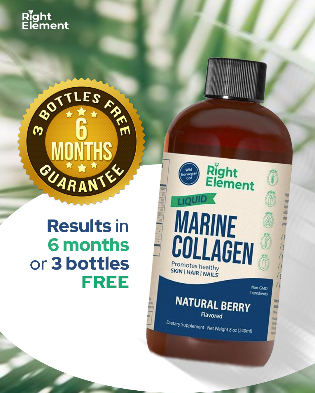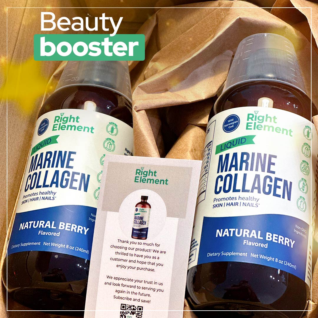 Right Element Liquid Marine Collagen is a daily supplement that contains a unique blend of essential ingredients including wild-caught cod, hyaluronic acid, keratin, bamboo extract silica, and selected vitamins. It helps your body replace the collagen that gradually stops producing with age. Daily collagen supplement gives men and women stronger hair.