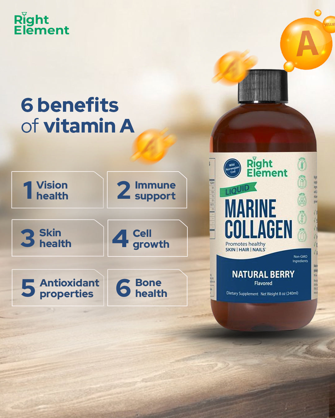 The specific vitamins in the Right Element product are Vitamin C, Vitamin A, known are Retinol, Vitamin D, Vitamin E, and Vitamin B7, known as Biotin.